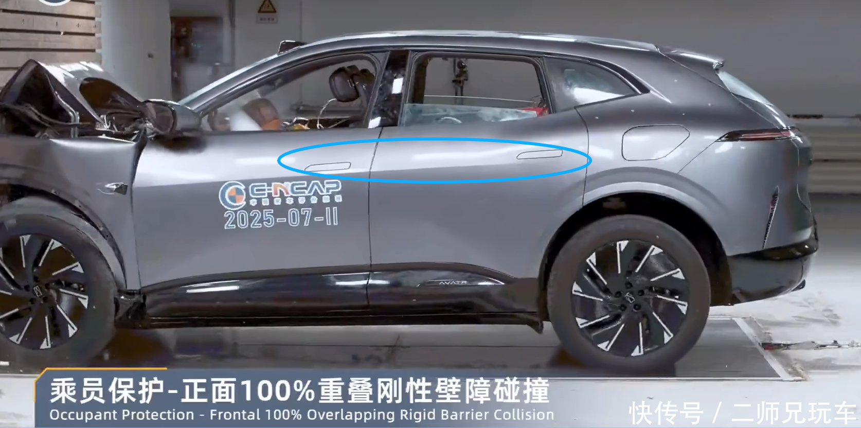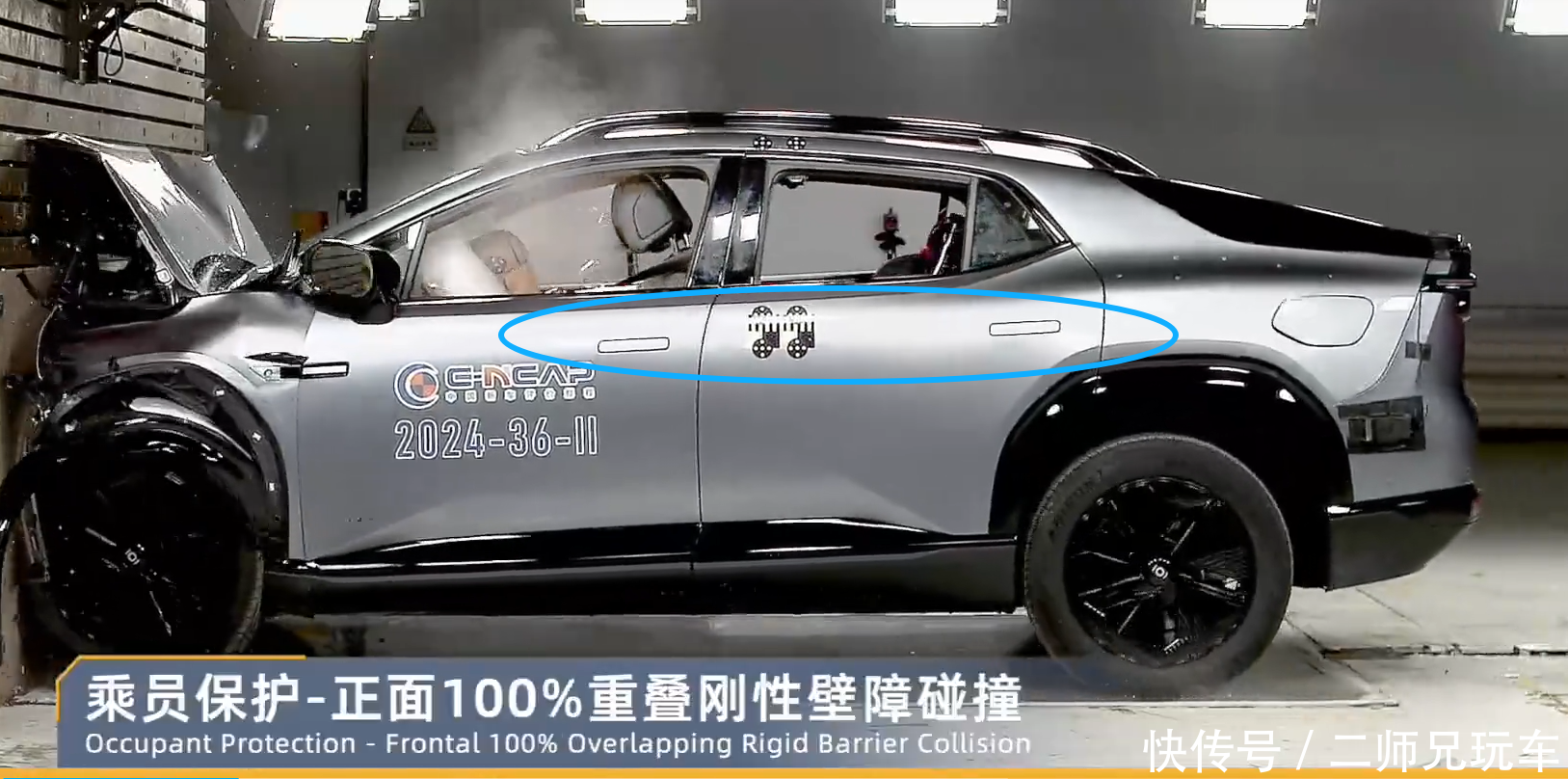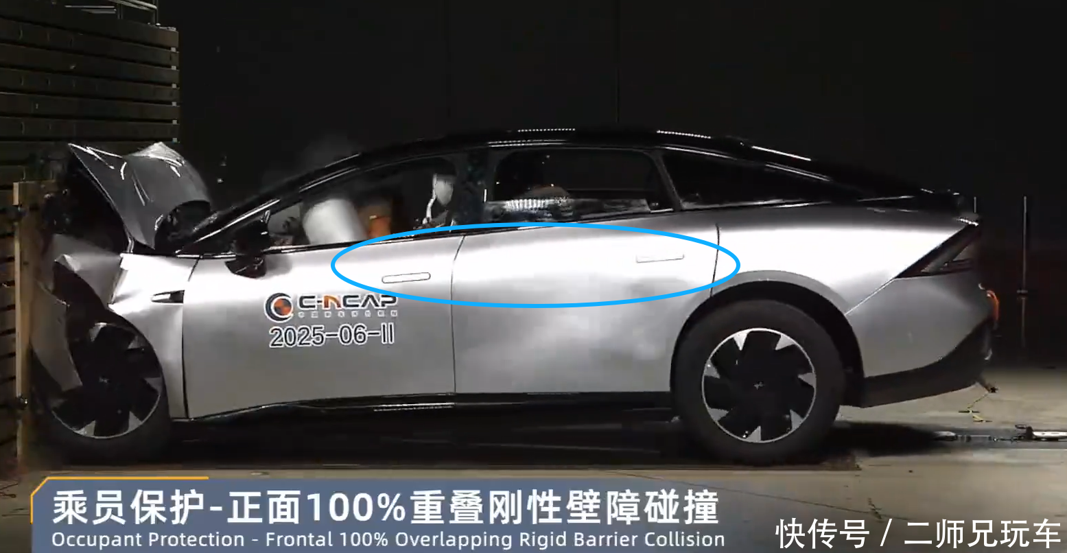 我们仔细去翻阅过C-NCAP过往碰撞测试中的历史视频,两种方案都有,本次事故发生的时间是2025年3月,由此推算涉事车型为2024款,从 C-NCAP 实测视频来看,该车型碰撞后隐藏式门把手采用不弹出的设计方案。