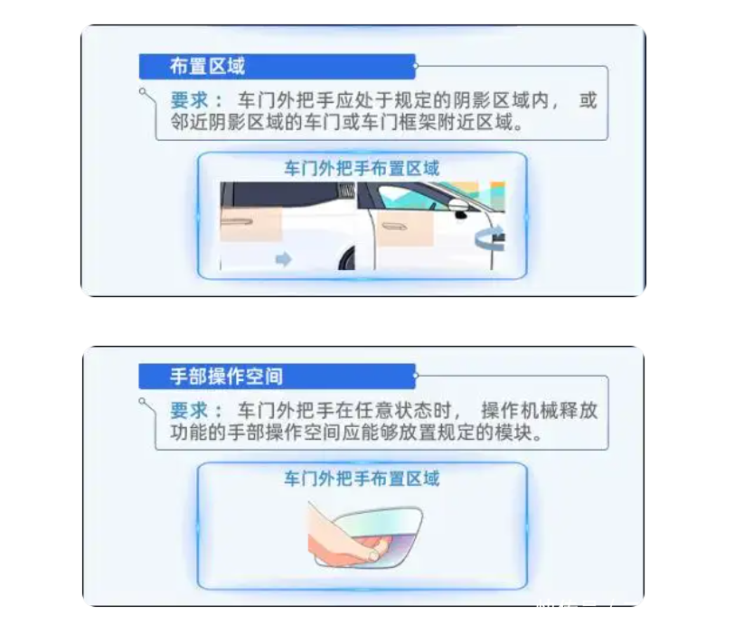 新规的核心要求包括:车门外把手需预留不小于60mm×20mm×25mm的手部操作空间,每个车门必须配备独立的车内外机械释放装置,不依赖车辆电路、电机即可开门,碰撞后救援人员无需专用工具就能开启非碰撞侧车门。这些要求直击全隐藏式门把手的核心安全痛点,解决了“断电打不开、不会操作、救援难”的问题。